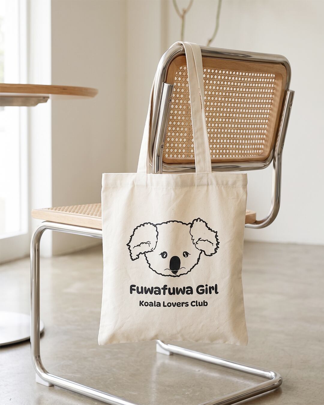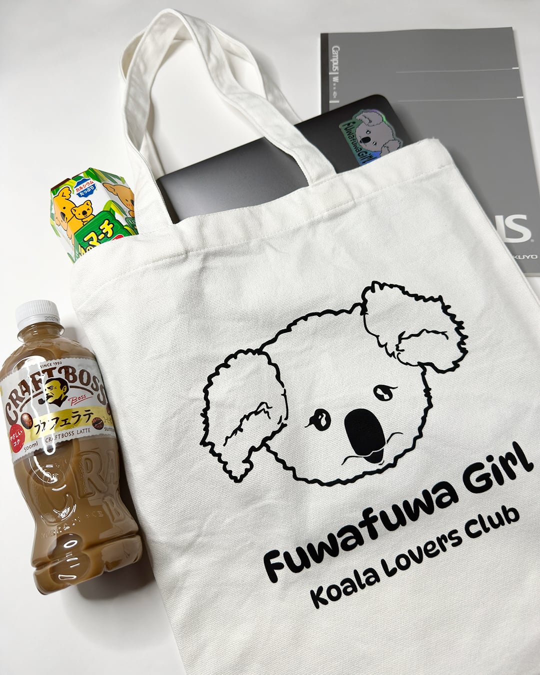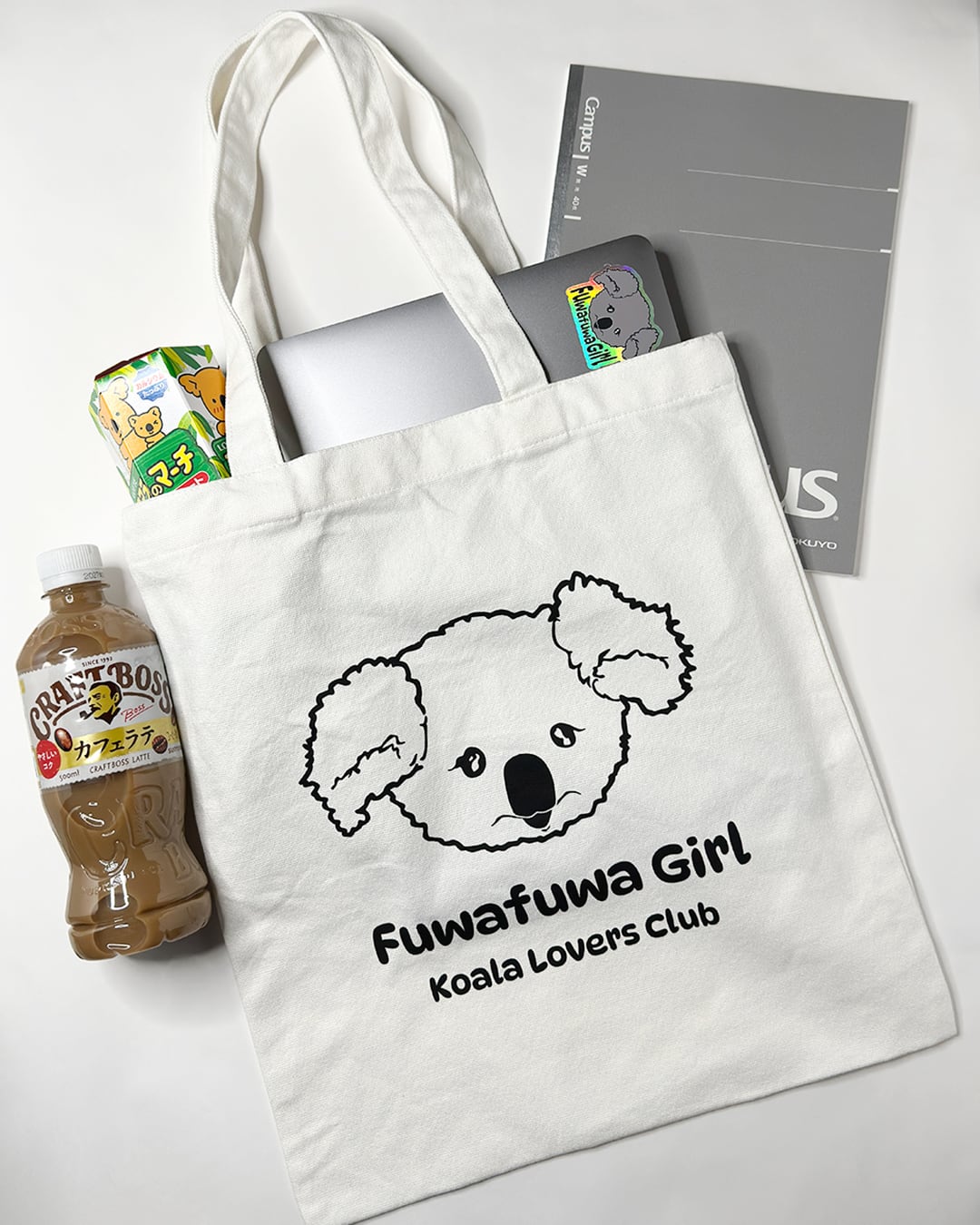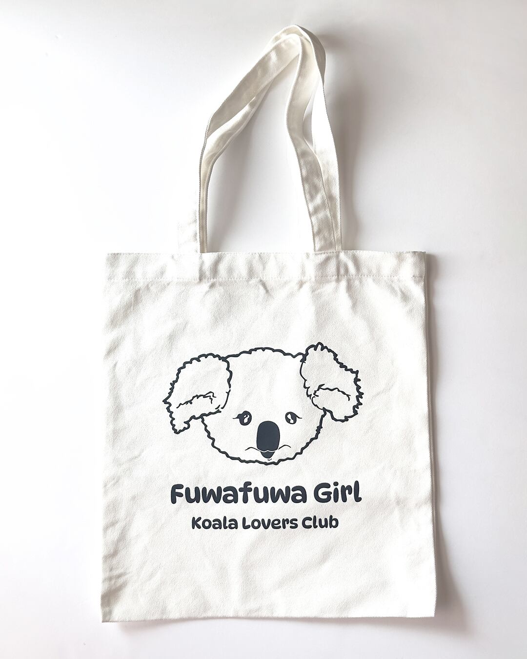 デザインは、ふわふわな垂れ耳がキュートな「Fuwafuwa Girl」 。クリーンなホワイトのボディは、どんなお洋服にも合わせやすくて、間違いのないアイテムです 。「Koala Lovers Club」のプリントもGOOD。
